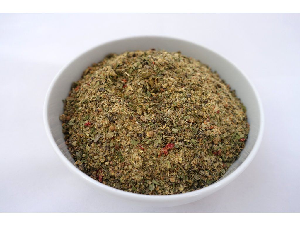 | Skład | Rzymski kminek, piępra czarna, wzmacniacz smaku (glutaminian sodu), sól gruboziarnista (10%), maltodekstryna, cukier, płatki papryki zielonej, kolendra, sól, natka pietruszki, płatki papryki czerwonej, bazylia, cebula, czosnek, papryka wizualna, kurkuma. |